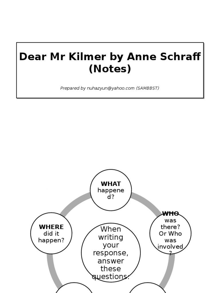 Dear Mr Kilmer Notes : Pelangi 19 Understanding New Lit Selected Poems Novel Dear Mr Kilmer Form 5 Topbooks Plt : An event which taught me lessons about life in the novel, dear mr kilmer, by anne scraff, is when richard becomes the lone signer of the card sent to the schemer.