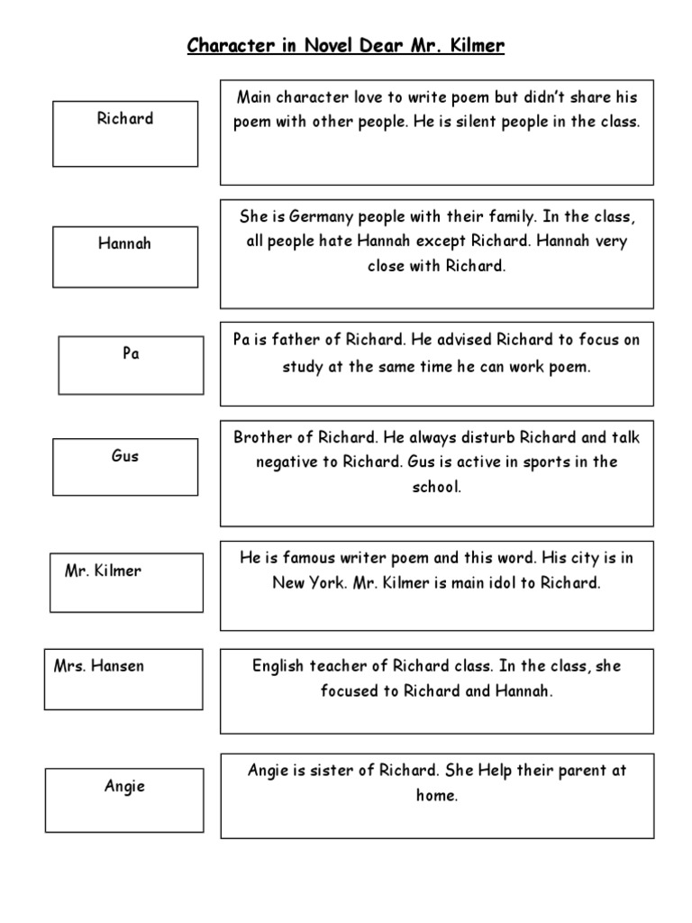 It should be noted that despite gus wanting to make a trophy out of the kill, pa disallowed it, with richard even adding: • gus did not believe that mr kilmer was famous. Documents similar to dear mr kilmer characters notes. The novel that i have learned is dear mr. Kilmer, richard is more confident with his poetry. Kilmer by anne schraff, a theme i have learnt is determination. Mr kilmer advised richard to share his poetry with people around him. Synopsis,setting, characters, themes, moral values, point of view, tone and mood, language and style, literary device. Can a person be both sensitive to nature and brave? An event which taught me lessons about life in the novel, dear mr kilmer, by anne scraff, is when richard becomes the lone signer of the card sent to the schemer. Major characters richard knight minor characters mr. Mr schermers and mrs schermers. While gus is interesting in basketball.