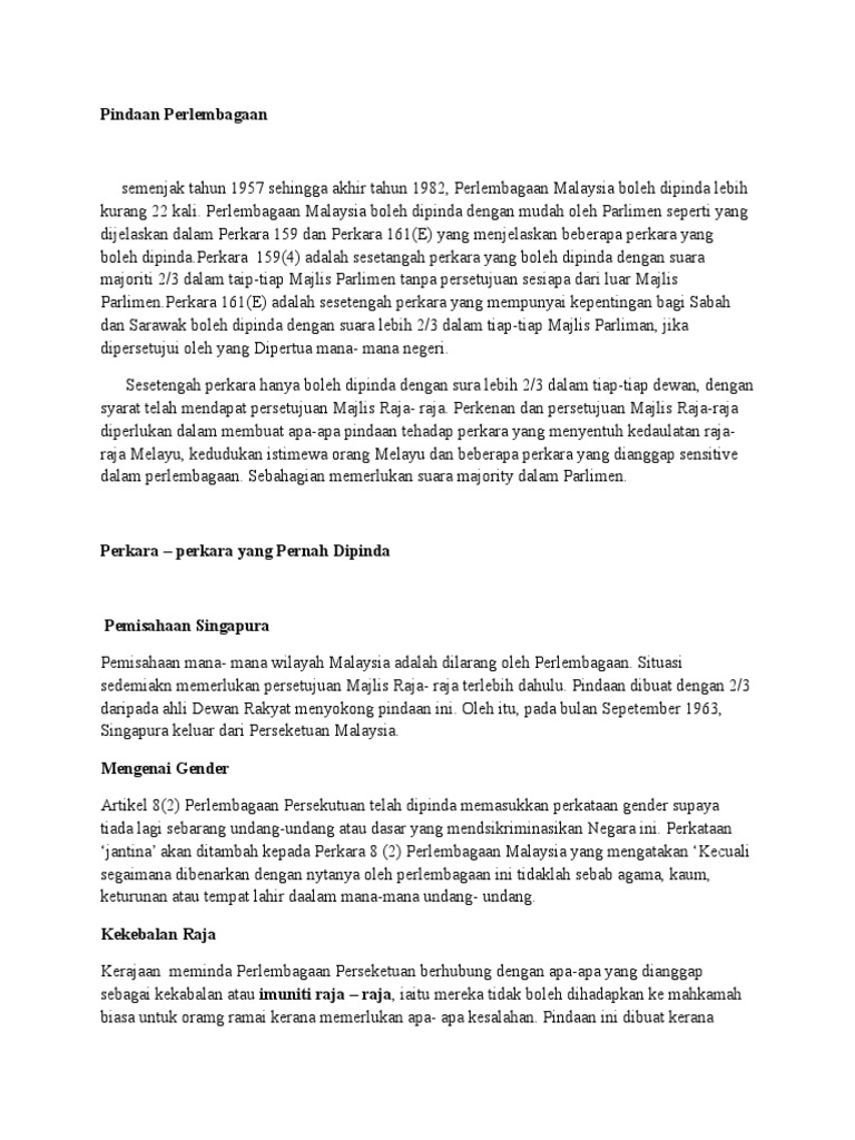 Pindaan artikel 160 (2) perlembagaan persekutuan adalah bagi mengembalikan status sabah dan sarawak sebagai rakan kongsi setara dalam agong mempunyai kuasa untuk mengisytiharkan darurat seperti termaktub dalam perlembagaan melalui perkara 40 dan dibaca bersama perkara 150. Perlembagaan malaysia mengandungi 15 bahagia, 183 perkara dan 13 jadual. Dr noraini zulkifli perlembagaan malaysia mengandungi 183 perkara. Perlembagaan membenarkan pengisytiharan darurat melalui perkara 150 perlembagaan persekutuan. Ringkasnya, perlembagaan malaysia menyentuh bidang kuasa eksekutif, legislative, kehakiman, kedudukan istimewa orang melayu. 31 ogos 1957 berikutnya diperkenalkan sebagai perkara 79. Sudah jelas termaktub dalam perkara 152 perlembagaan persekutuan namun bagi urusan rasmi negara, tidak boleh bahasa selain bahasa melayu kerana perkara itu jelas termaktub dalam perkara 152 perlembagaan persekutuan, katanya ketika dihubungi nstp, di sini, hari ini. Masyarakat tidak faham apabila mereka tidak mengetahui perkara yang sebenarnya ditafsirkan oleh perlembagaan. Sila jelaskan kefahaman anda berdasarkan perkara di atas. Seksyen 6 dan 13 akta prosedur kewangan 1957. Selaku pihak yang akan terkesan dengan perjanjian tersebut. Perlembagaan persekutuan malaysia/senarai perkara yang dipinda. Satu akta yang membenarkan menteri kewangan mengeluarkan sejumlah wang seperti yang diluluskan oleh parlimen daripada kumpulan wang disatukan.