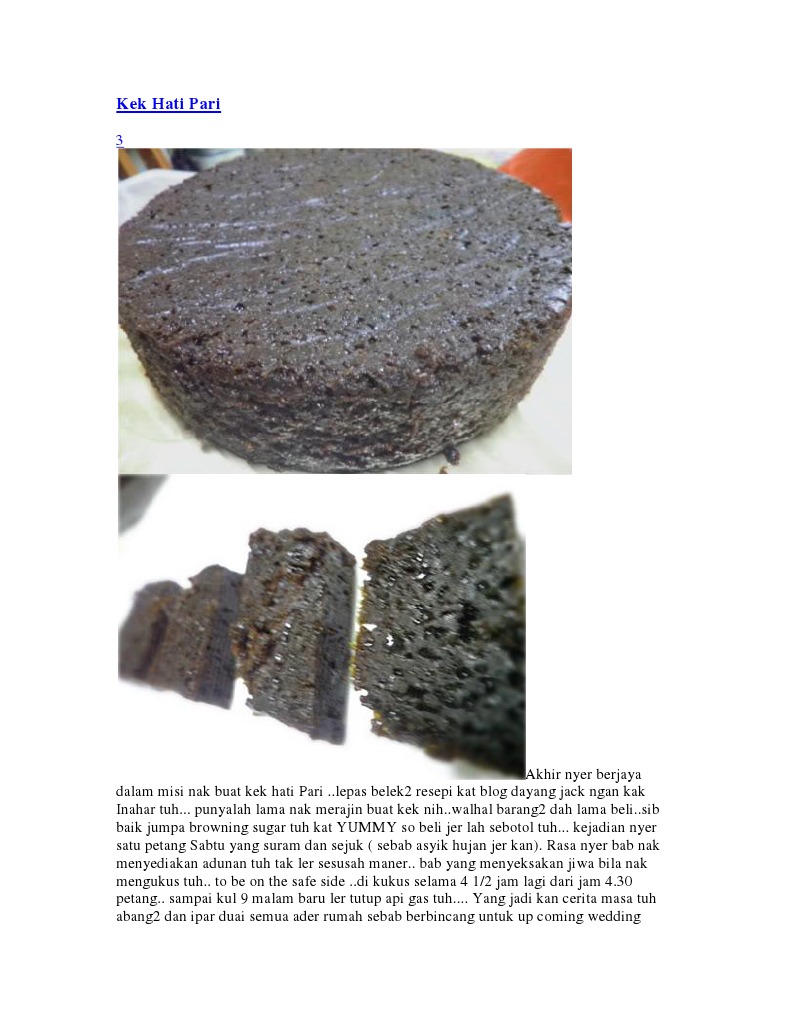 Kek hati pari sangat terkenal di sarawak sejak sekian boleh tahan berbulan2 sehingga hampir setahun (penjagaan betul). Resepi kek buah kukus legend versi orang lama. 10 biji telur gred b ( 2 biji di buang putihnya) 8 gelas tepung gendum 4 gelas gula merah 300 gm kismis hitam 1 keping coklet catbury 16 oz mentega 4 sudu bicarbonate of soda 2 gelas gula pasir (dihanguskan) 7 sudu. 0 ratings0% found this document useful (0 votes). Jom buat kek dengan bantuan aplikasi pelbagai resepi kek.