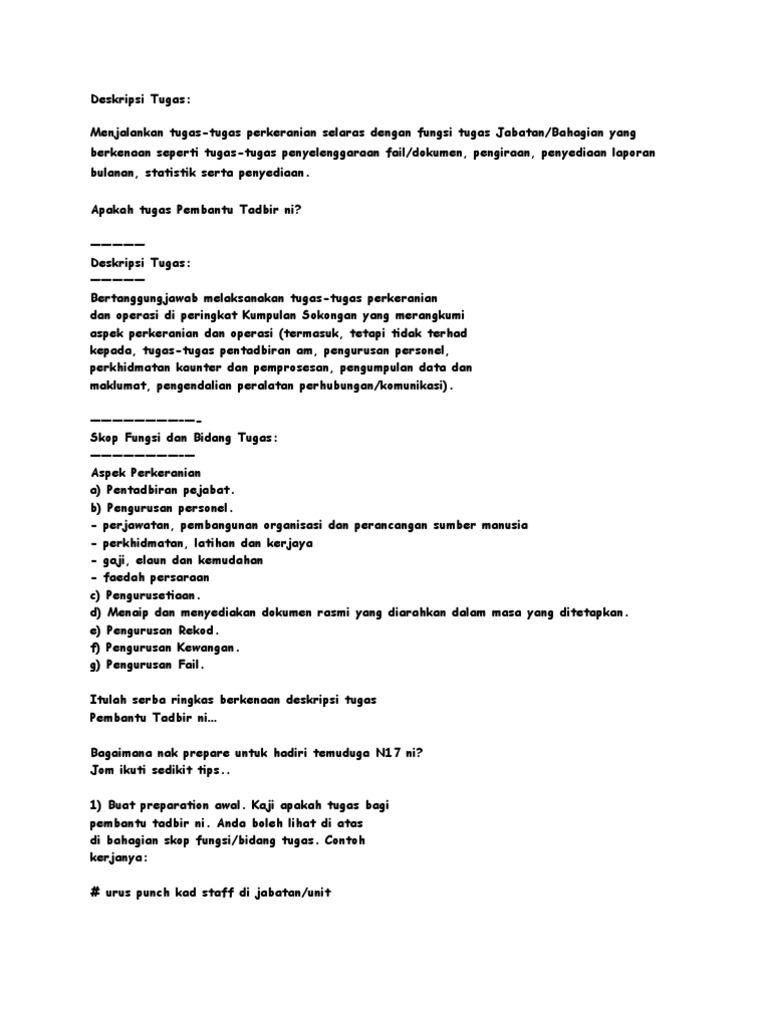 Related : Deskripsi Tugas Pembantu Tadbir : Senarai Tugas Pembantu Tadbir / Pembantu tadbir (perkeranian/operasi) gred n19..
